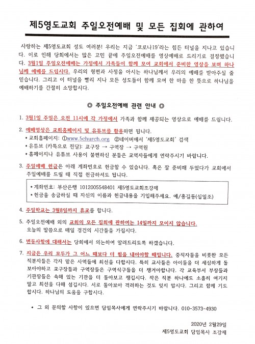 주일오전예배 및 모든 집회 안내(2/29) 페이지 정보 작성자 관리자 작성일 20-02-29 18:46 조회 1,331회 본문 <제5영도교회 주일오전예배 및 모든 집회 안내>2/29 17:30 이전글주일예배 공지사항(3/13) 다음글제5영도교회 코로나19 대응지침4(2/28) 목록